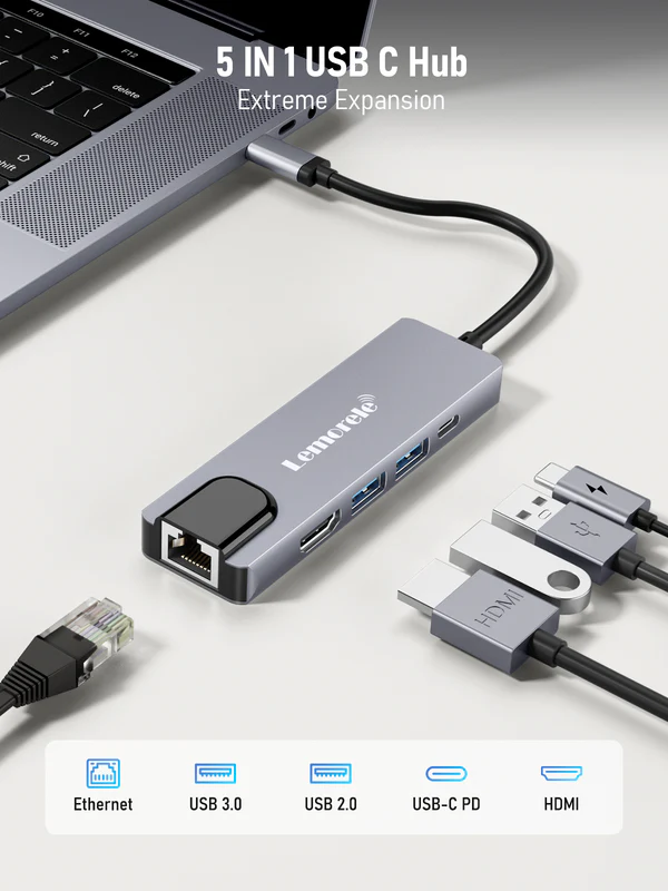 The Lemorele (TC15PLUS) 5-in-1 Type-C to {USB + Type-C + HDMI + LAN} HUB Metal is a professional multiport solution designed to maximize productivity and enhance connectivity for modern laptops and Type-C devices. As many new devices come with limited ports, this hub provides the essential connections you need to create a complete workstation—anytime, anywhere.