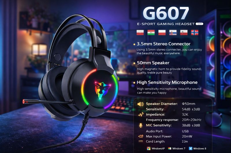Using a 3.5mm stereo audio connector, the NEWMI G607 offers broad device compatibility and stable audio performance. The additional USB connection powers the LED backlight, adding a modern e-sports aesthetic without affecting sound quality. With support for Windows XP, Windows 7, and Windows 8, it fits seamlessly into most PC gaming setups.