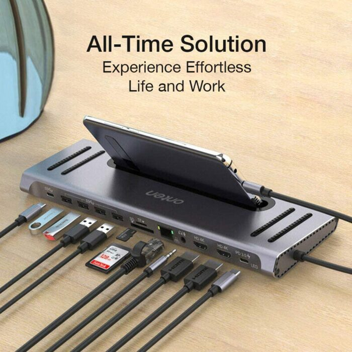 The ONTEN (OTN-9199A) 13-in-1 USB-C Multi-Function Docking Station is a powerful expansion hub designed to transform your laptop into a complete workstation. With multiple connectivity options in one compact device, it allows you to connect displays, storage devices, network cables, and accessories easily.