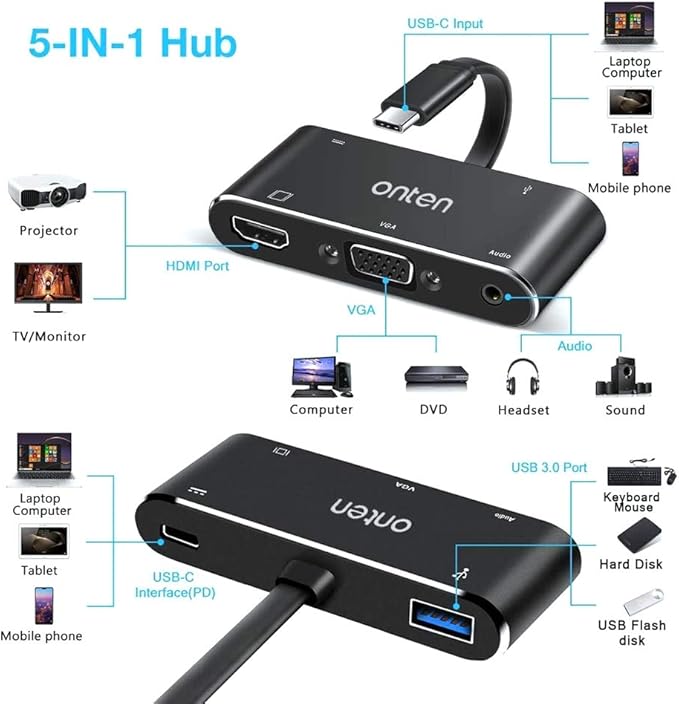 The ONTEN (OTN-9573S) 5-in-1 USB Type-C Hub is a powerful and compact expansion solution designed for modern MacBooks, notebooks, and USB-C mobile devices. Engineered to bridge the gap between next-generation USB-C ports and traditional peripherals, this hub delivers convenience, performance, and versatility in a single sleek device.