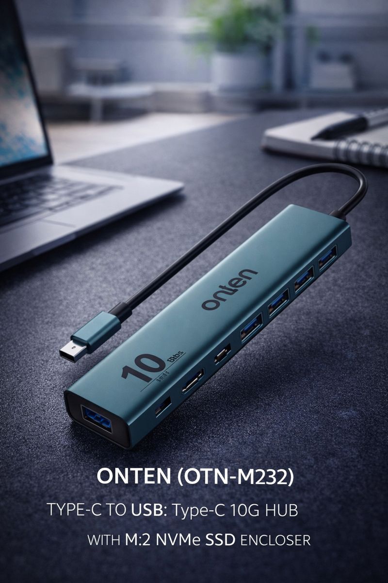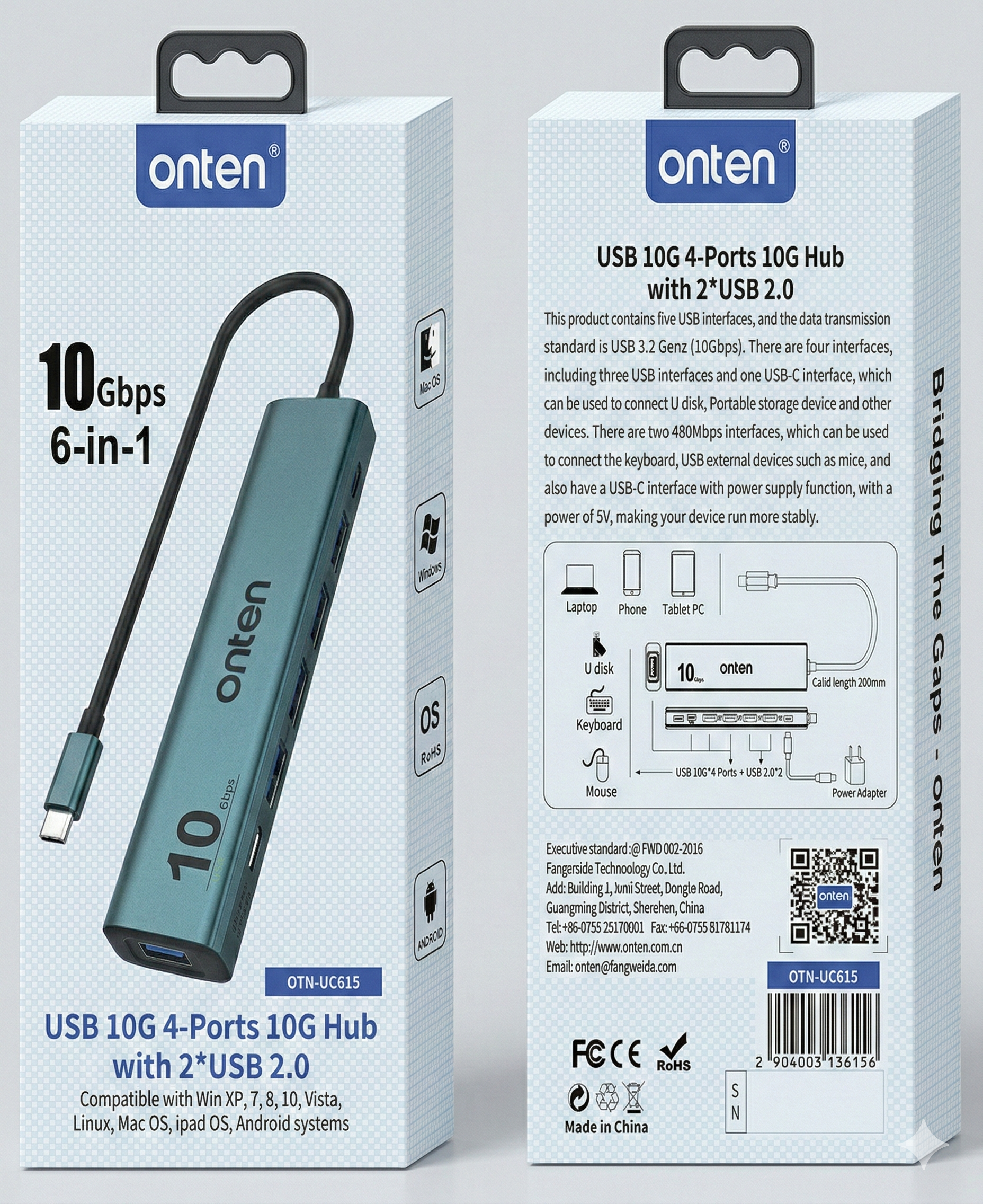 The ONTEN (OTN-UC615) 6-in-1 USB 3.2 Gen 2 10G Hub is a high-performance connectivity solution designed to expand a single USB-C port into multiple high-speed interfaces. Built with USB 3.2 Gen 2 technology, it delivers data transfer speeds of up to 10Gbps, making it ideal for modern laptops, tablets, and smartphones that require fast and reliable expansion.