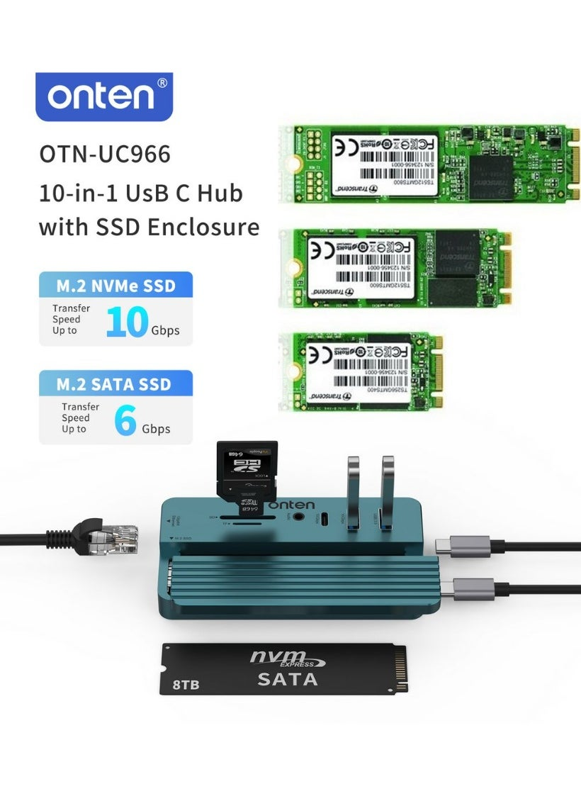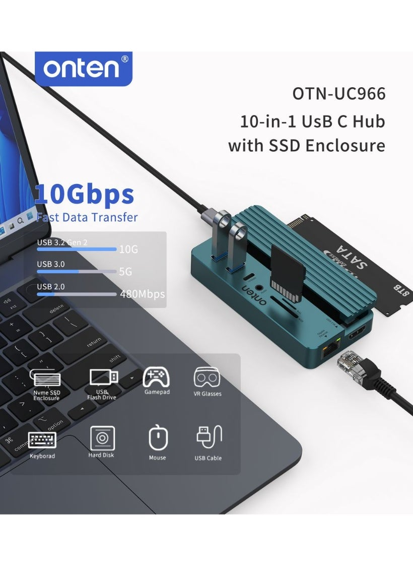 ONTEN (OTN-UC966) 10-in-1 USB-C Hub with M.2 SSD Enclosure, 4K HDMI, Gigabit LAN & 100W PD