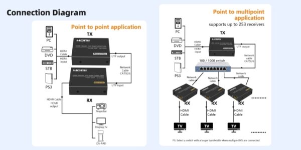 The FJGEAR FJ-HEA60A HDMI 60M HD 1080P Network Cable Extender is an engineering-grade HDMI signal transmission device, crafted with high-quality materials and advanced chips. It is ideal for monitoring signal transmission, business conferences, home audio-video setups, and various other applications, enhancing your audio-video experience across multiple scenarios. The connection of this high-quality HDMI cable extender is very simple. First, connect the power supply to both the receiver and the transmitter. Then, use an HDMI cable to connect the input device to the transmitter, and another HDMI cable to connect the output device to the receiver. Finally, use a Cat5e/Cat6 cable to connect both ends of the device, as shown in the picture on the right. Easy to Set up and Use – plug and play, no external drivers required. The FJGEAR FJ-HEA60A is simple to use: just connect the product to the corresponding input and output ports and devices using high-quality cables. It extends the transmission distance of your HDMI signal devices, ensuring stable, delay-free picture quality. This 60m HDMI Extender supports 3D visual effects and a resolution of 1920*1080P, delivering a stable picture without delay within a range of 60 meters. It supports a connection mode with one transmitter and multiple receivers, accommodating up to 253 receivers. This makes it adaptable to various applications, significantly enhancing your audio and video experience and providing added convenience.