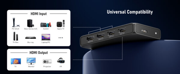 Wide compatibility: the HDMI switch is compatible with most devices with standard HDMI interface. It is compatible with laptop, PS5 / PS4 / PS4 Pro, Xbox One / Xbox 360, Blu-ray/DVD, TV stick, fire stick, chromcast, TV box, DVD, HDTV, set-top box, monitor, projector, screen
