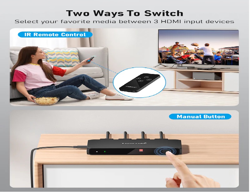 This video switcher hasmulti-channel input and single-channel output functions, supporting the simultaneous connection of three HDMI devices and switching their content to an HDMI monitor or TV for viewing. You can easily switch different HDMI input sources through this switch, such as TV boxes, game consoles, computers, etc., so that you can enjoy content from multiple video sources on one display device. This eliminates the need to frequently plug and unplug HDMI cables and allows you to easily manage multiple devices with just one switch.