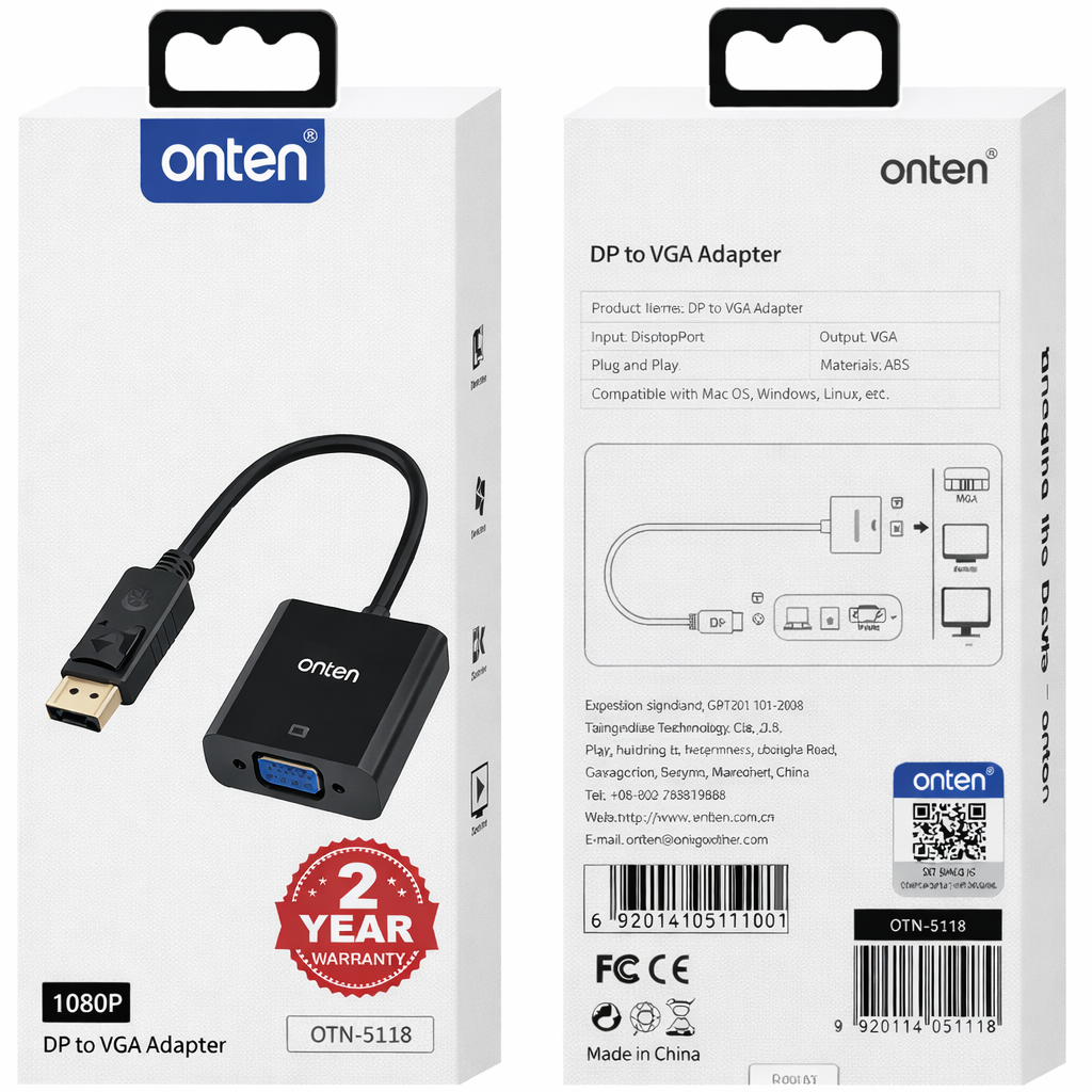 The ONTEN (OTN-5118) DP to VGA Converter is a reliable and professional-grade solution designed to bridge modern DisplayPort-enabled devices with traditional VGA displays. Ideal for offices, classrooms, conference rooms, and home setups, this adapter ensures seamless video output without the need to upgrade existing VGA monitors or projectors.