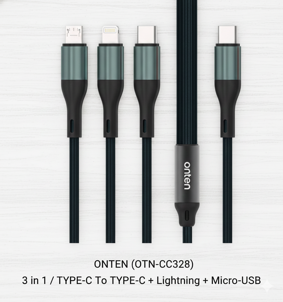 The ONTEN (OTN-CC328) 3-in-1 Charging Cable is a smart and convenient solution for users with multiple devices. Featuring a Type-C input and three output connectors—Type-C, Lightning, and Micro-USB (M5)—this cable allows you to charge different devices without carrying multiple cables.