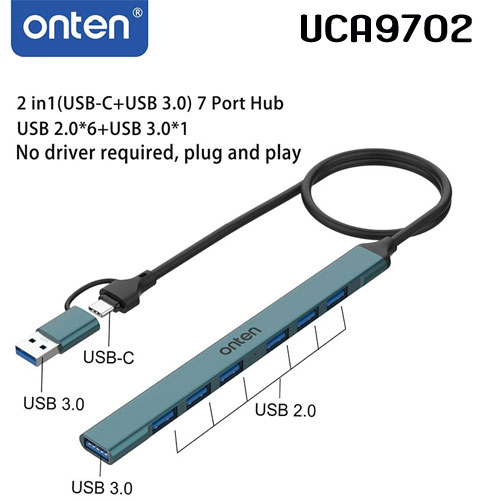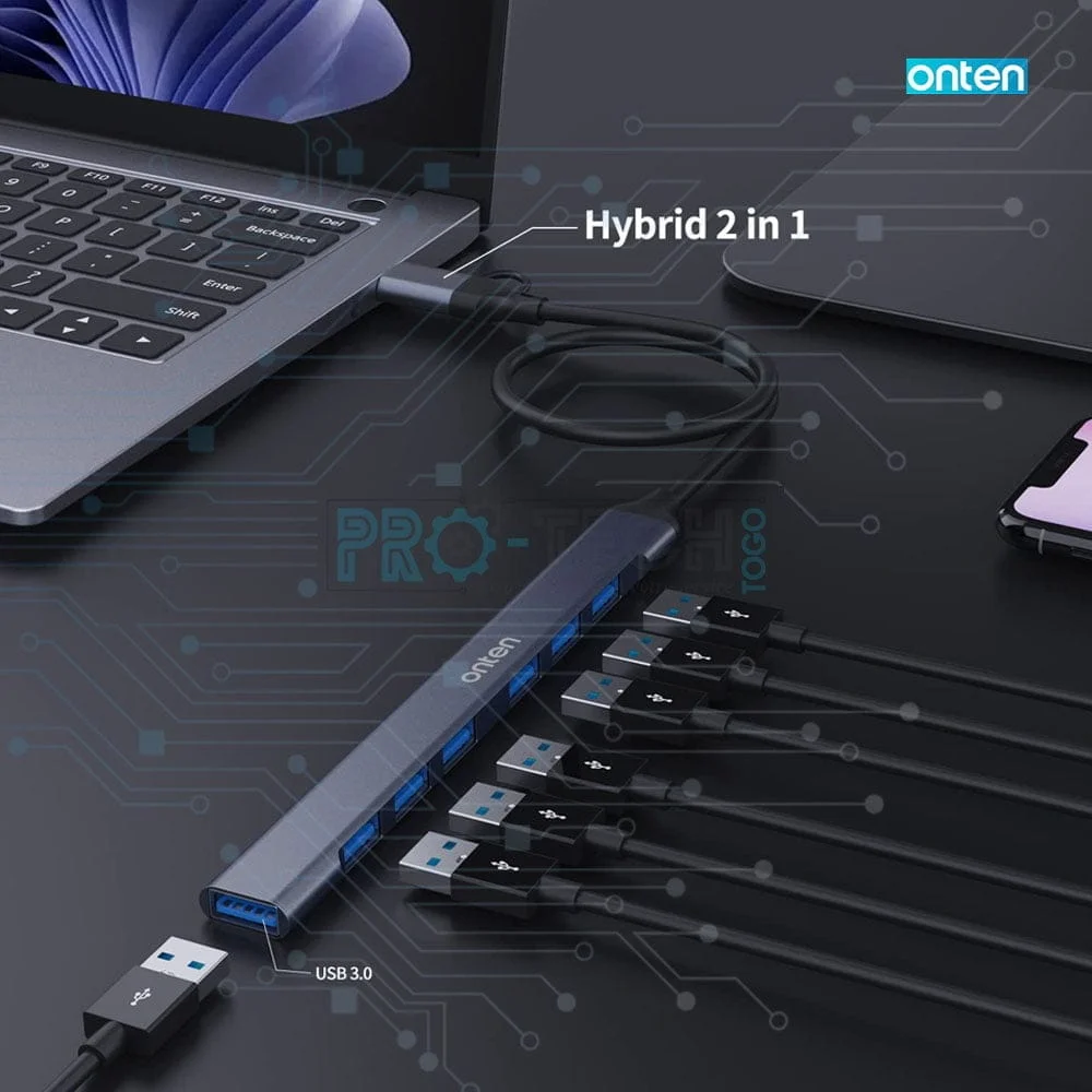 The ONTEN (OTN-UCA9702) USB 3.0 + Type-C to 6-Port USB Hub is a practical solution for users who need more USB ports without hassle. Supporting both USB-A and USB-C input, it works seamlessly with a wide range of laptops, PCs, and modern devices.